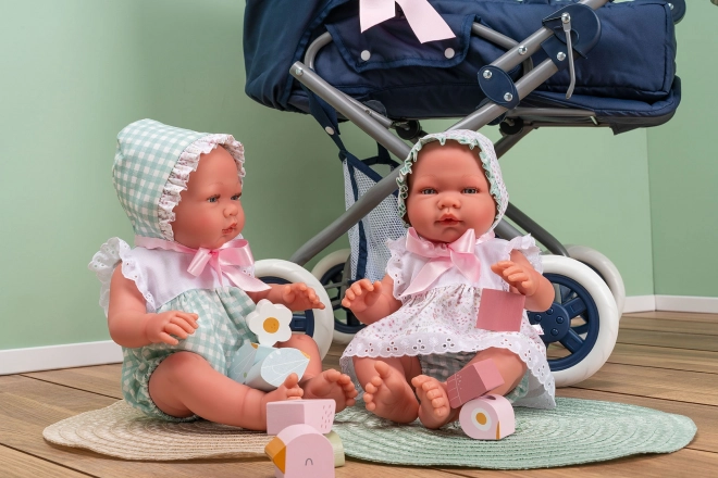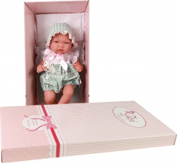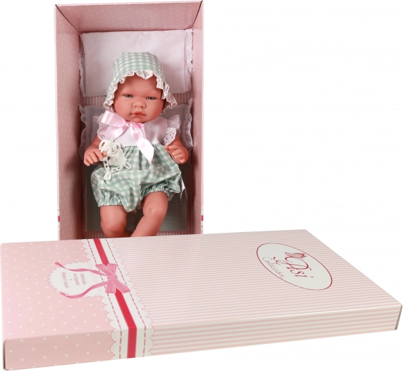 Pablo jest ubrany w stylowy zielono-biały letni rampers bez rękawów z krótkimi nogawkami, ozdobiony białą koronką, uzupełniony czapeczką wiązaną pod brodą. Leży na miękkiej poduszeczce z kołderką i ma smoczek na łańcuszku, który można włożyć do buzi, gdzie trzyma się stabilnie. Producent ASI (Asivil) to rodzinna hiszpańska marka z ponad 50-letnią tradycją, stawiająca na w 100% lokalne rzemieślnicze wytwarzanie oraz rygorystyczne europejskie standardy.