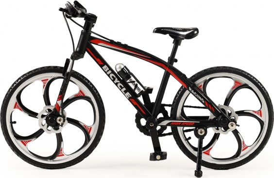 Odkryj szczegółowo wykonany mini rower górski w eleganckiej czarnej kolorystyce z czerwonymi akcentami. Ten metalowy model z wolnym biegiem kół wiernie naśladuje prawdziwy rower – od ramy, przez kierownicę, po wyraziste obręcze. Doskonale sprawdzi się jako prezent dla miłośników kolarstwa oraz jako dekoracja na biurko lub półkę.