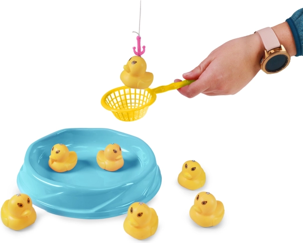 Zabawna wodna gra dla małych wędkarzy zawiera magnetyczną wędkę, plastikowy mini stawik oraz 6 uroczych kaczuszek. Wystarczy napełnić pojemnik wodą, włożyć kaczuszki i zacząć je łowić – łatwo i bezpiecznie dzięki magnesom. Świetna zabawa, która rozwija motorykę małą oraz koordynację ręka–oko.