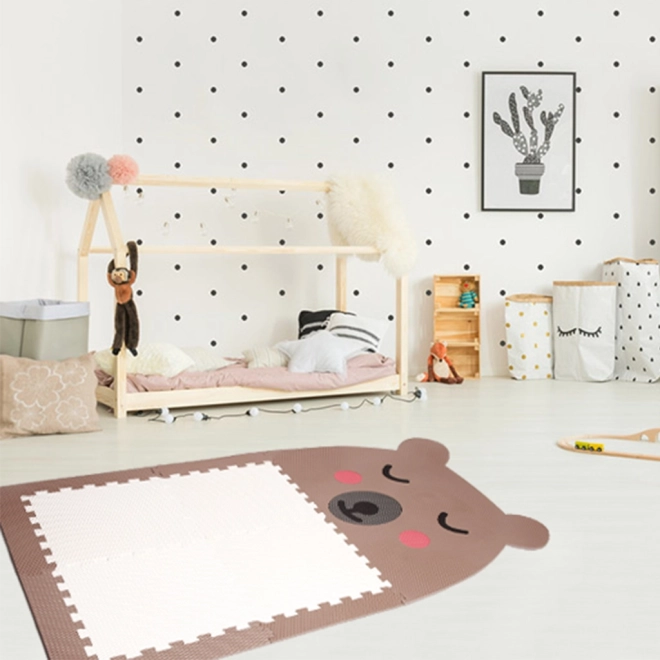 Designowa podłoga puzzle w kształcie misia w brązowym kolorze z białym brzuszkiem przyniesie do dziecięcego pokoju zabawę i przytulność. Świetnie nadaje się dla dzieci do zabawy, zapewniając jednocześnie wygodną i miękką powierzchnię. Łatwa konserwacja i bezpieczeństwo to kluczowe cechy tego produktu.