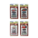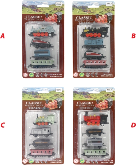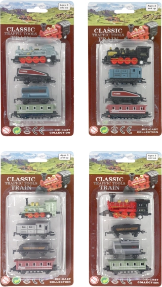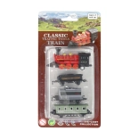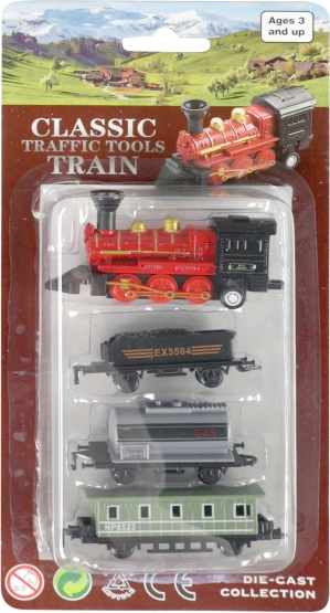 Zestaw zawiera metalową lokomotywę i trzy plastikowe wagoniki, idealne dla małych kolekcjonerów.