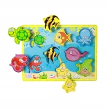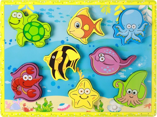 Dzieci w zabawny sposób uczą się rozróżniać kształty i kolory poszczególnych morskich zwierząt, co wspiera percepcję wzrokową i koncentrację.