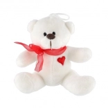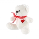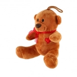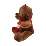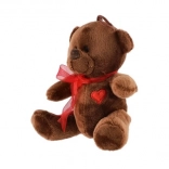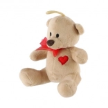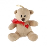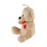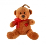 Pluszowy miś z kokardą i sercem nadaje się jako prezent lub dekoracja do pokoju dziecięcego.