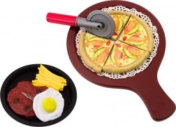 Pizza podzielona na 4 kawałki oraz dołączone radełko dają dzieciom wrażenie prawdziwego krojenia i serwowania. Świetna podstawa do zabawy w pizzerię.
