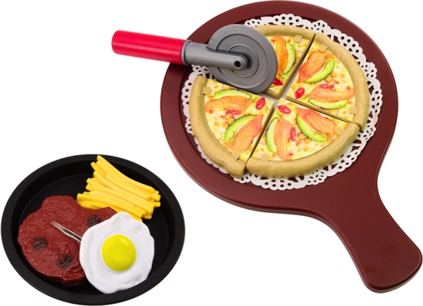 - Pizza (4 kawałki), radełko, łopatka, frytki, stek, jajko, owoce, 2 lody, 3 desery, talerz, miska, taca, 2 widelce, 2 noże