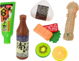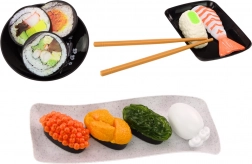 - Realistyczne akcesoria: ryż, nori, wasabi, łosoś, krewetka, surimi, małże, ośmiorniczka, miseczki, pałeczki.