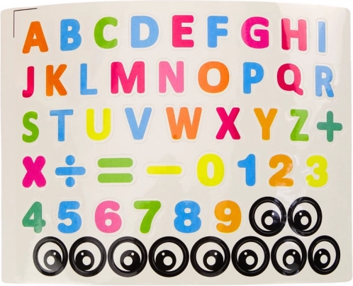 - Elementy edukacyjne – naklejki z literami i cyframi