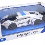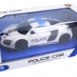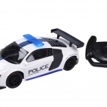 Biała karoseria z niebieskimi elementami, napisy POLICE oraz świetlna belka przyciągają wzrok i dodają autentyczności zabawie.