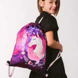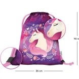 Wytrzymały i zmywalny worek na obuwie z motywem konia, idealny do noszenia sprzętu sportowego lub drobiazgów. Mocne sznurki umożliwiają również wygodne noszenie na plecach.