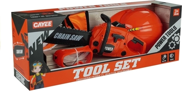 dziecięca elektryczna piła łańcuchowa z dźwiękiem i ruchomym łańcuchem + okulary ochronne