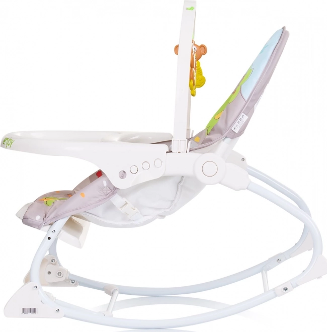 3‑punktowe pasy bezpieczeństwa, możliwość blokady bujania oraz zdejmowany stolik zapewniają wygodę i bezpieczeństwo na co dzień.