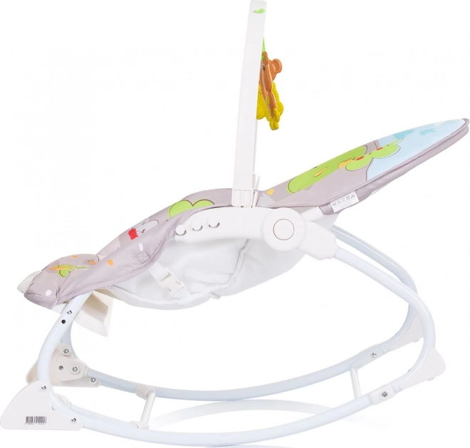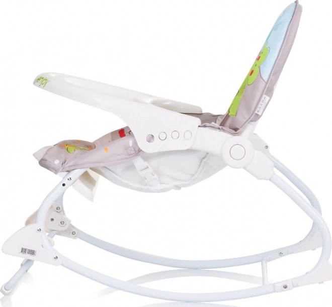 Dziecięcy bujaczek Enjoy dinozaur łączy spokój i zabawę w jednym. Połączenie melodii i delikatnych wibracji pomaga uśpić i ukołysać, a pałąk z zabawkami wspiera rozwój zmysłów i motoryki. Dzięki dwustopniowej regulacji oparcia łatwo dopasujesz pozycję do odpoczynku i zabawy.