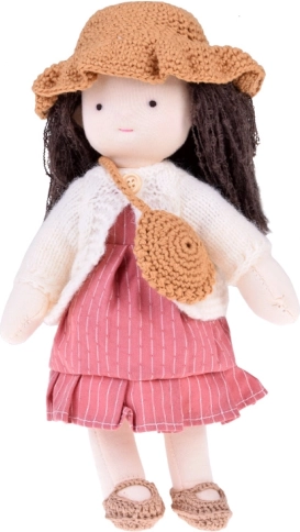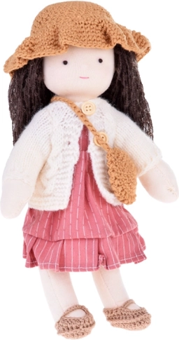 Lalka ubrana jest w różowe i beżowe odcienie: ma pasiastą sukienkę, dziergany kardigan, kapelusik, dopasowane buciki oraz małą torebkę. Długie ciemne włosy i starannie dopracowane detale nadają lalce wyjątkowy urok. Eleganckie kartonowe pudełko czyni z niej piękny prezent na urodziny i Święta.