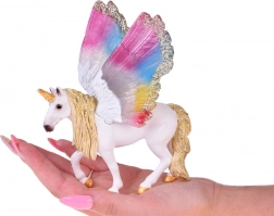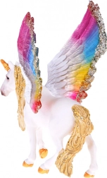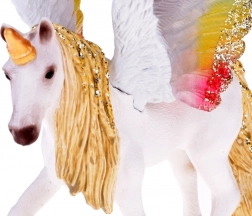 Urzekająca figurka jednorożca Pegaza z tęczowymi, połyskującymi skrzydłami, złotą grzywą i rogiem zachwyci małych i dużych kolekcjonerów. Jest ręcznie malowana, wykonana z trwałego plastiku i świetnie sprawdzi się zarówno do zabawy, jak i do kolekcji czy jako dekoracja do pokoju dziecięcego.