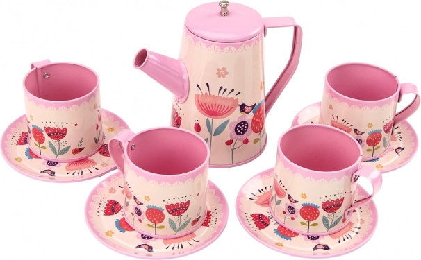 Uroczy dziecięcy metalowy zestaw do herbaty w różowym kolorze ucieszy wszystkie małe gospodynie i gospodarzy. Zawiera wszystko, co potrzebne do zabawy w kawiarnię: tacę, czajniczek, filiżanki i talerzyki. Dzięki solidnemu materiałowi zestaw jest trwały i bezpieczny dla dzieci od 3 lat. Kolorowe kwiatowe motywy i praktyczne elementy zmieniają każdą zabawę w radosną i realistyczną rozrywkę, która rozwija wyobraźnię i umiejętności społeczne.