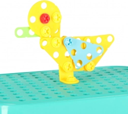 Perforowana płyta umożliwia wkręcanie kolorowych kołków i elementów w najróżniejsze wzory – od słoneczka po urocze zwierzątka.