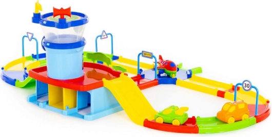 System wielobarwnych tras z mostami, tunelami i połączeniami dla pojazdów oraz samolotów zapewnia płynną jazdę i mnóstwo scenariuszy do zabawy.