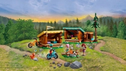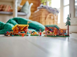 Zestaw LEGO Friends Przyjazne domki na letnim obozie pozwala młodym konstruktorom tworzyć opowieści z postaciami Paisley, Zackiem i Sky, które wyruszają na przytulny biwak. W zestawie znajdują się dwie chatki z otwieranymi dachami, dzięki czemu można zajrzeć do środka. Postacie są gotowe na nocleg ze śpiworami, przejażdżki na rowerach górskich i muzykę przy ognisku, gdzie pieką pianki marshmallow.