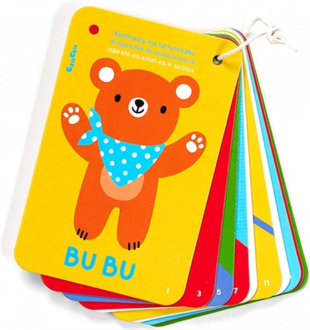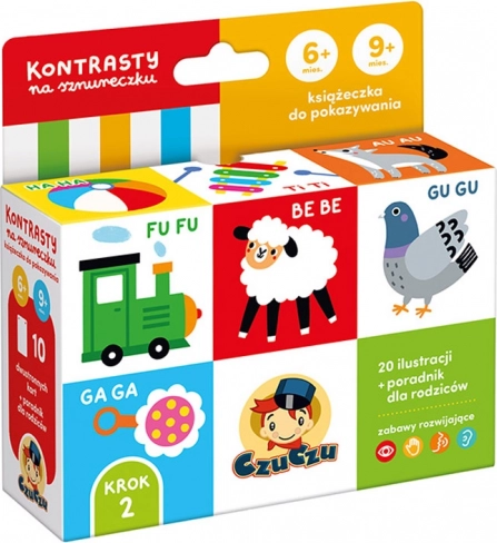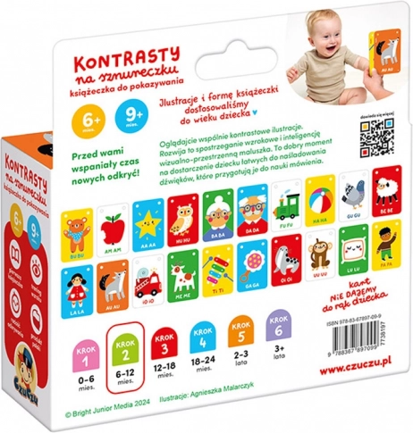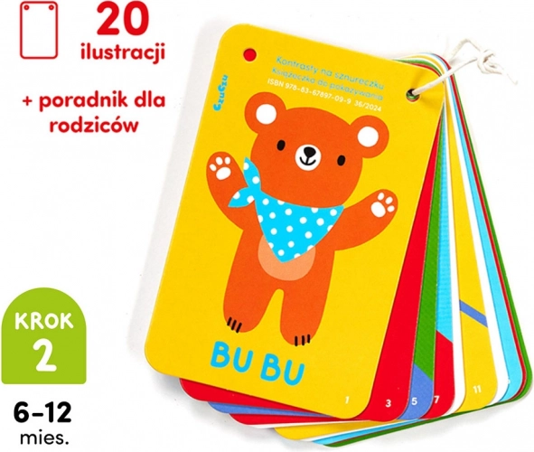 Odkrywaj świat z niemowlęciem dzięki kontrastowej książeczce CzuCzu na sznureczku. Wysoki kontrast ilustracji stymuluje wzrok, wspiera rozwój mowy oraz koncentrację. Dzięki praktycznym dziurkom i sznureczkowi łatwo przymocujesz ją nad łóżeczkiem lub zabierzesz w podróż.