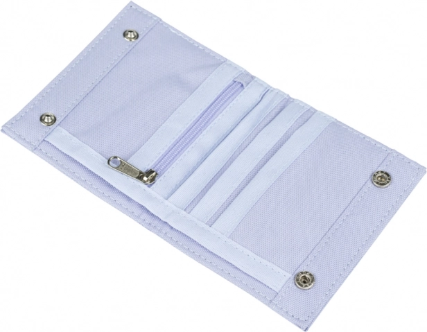 Praktyczny portfel studencki w eleganckim liliowym kolorze oferuje zapięcie na 2 napy, kieszeń na monety na zamek oraz przemyślaną przestrzeń na banknoty, karty i dokumenty – idealny do szkoły i na co dzień.