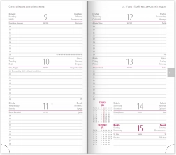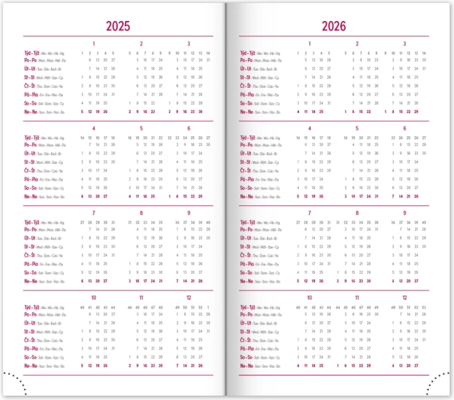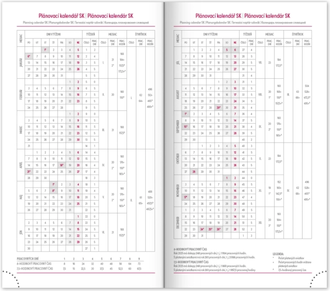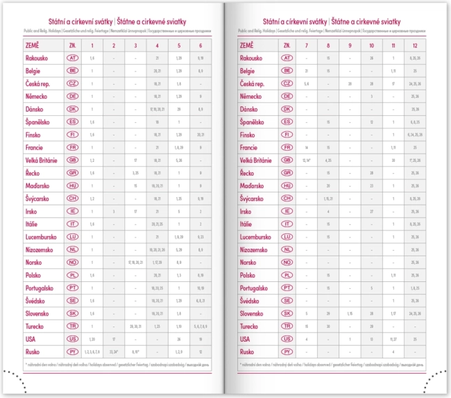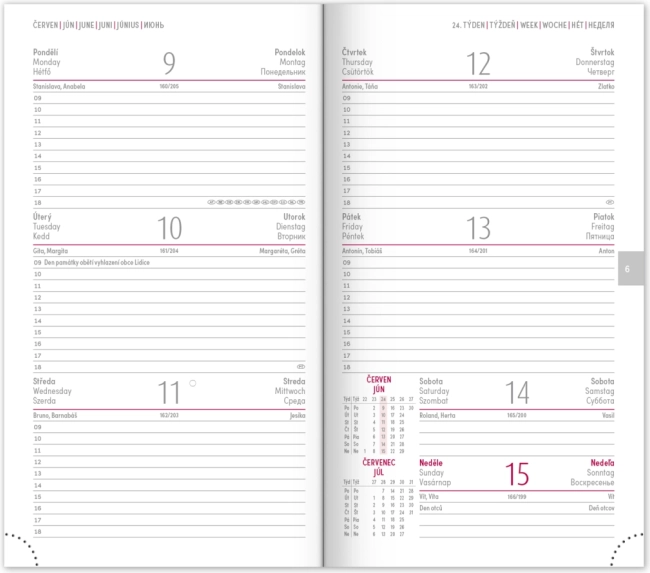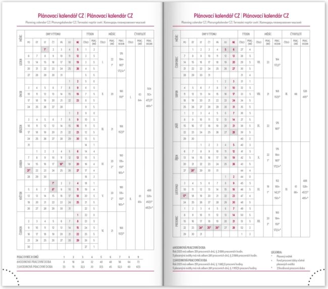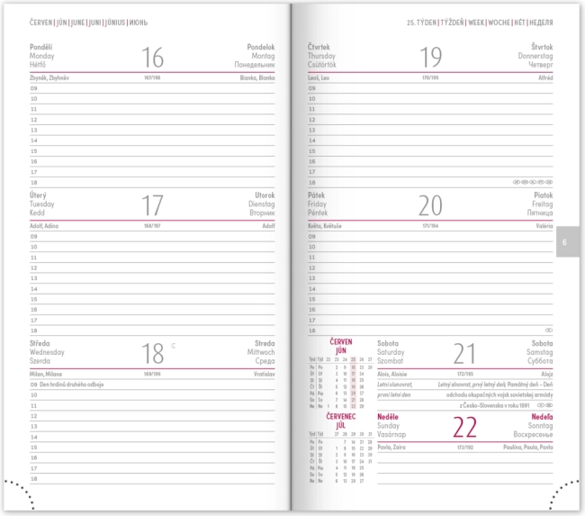 - Tygodniowy plan z kalendarzem w językach czeskim i słowackim, z dodatkami w angielskim, niemieckim, węgierskim i rosyjskim.