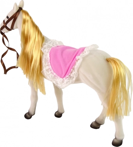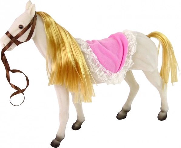 Zestaw zawiera marionetkę księżniczkę z ruchomymi kończynami i białym koniem, wykonanym z przyjemnego materiału dla realistycznego wyglądu.
