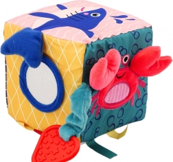 Kostka zawiera także szeleszczące elementy, które przy dotyku wydają delikatne dźwięki, stymulują słuch i sprzyjają zabawie.