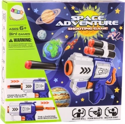 Gra Space Adventure zamienia każdy dziecięcy pokój w małą strzelnicę z galaktyczną atmosferą. Duża tekstylna tarcza z kolorowym kosmicznym motywem i wyraźnie oznaczonymi wartościami punktów zachęca do celnego strzelania oraz nauki liczb. Bezpieczne piankowe naboje i piłeczki na rzep trzymają się tarczy bez ostrych grotów, dzięki czemu dzieci mogą bawić się bez obaw.