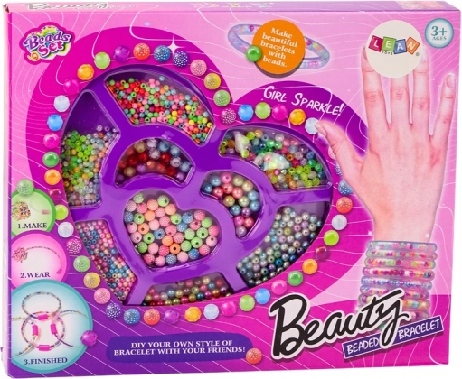 - Zawartość opakowania: koraliki (miks kształtów, kolorów i rozmiarów), 6 przezroczystych rurek, sznurek do nawlekania, etui w kształcie serca.