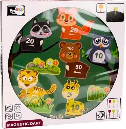 Ta magnetyczna gra w tarczę zapewnia dzieciom godziny radosnej i bezpiecznej zabawy. Kolorową zieloną tarczę zdobią zwierzątka (żyrafa, lis, tygrys itd.) z wartościami punktowymi, które motywują do poprawiania rezultatów. Mechanizm magnetyczny eliminuje ostre groty, dzięki czemu gra nadaje się także dla młodszych dzieci.