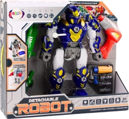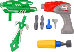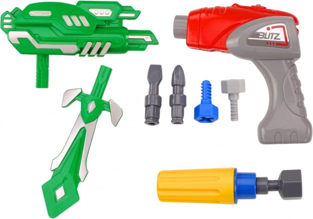 Zestaw zawiera wszystko, czego potrzeba do natychmiastowej zabawy: robota do montażu, zabawkową wiertarkę z nasadkami, miecz i zbroję oraz baterie typu AG13. Dzięki solidnemu plastikowemu wykonaniu idealnie nadaje się do codziennej zabawy i rozwijania myślenia technicznego.