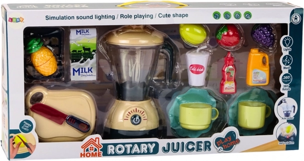 Zabawny kuchenny zestaw dla najmłodszych z elektrycznym mikserem, który ma efekty świetlne i dźwiękowe oraz funkcję obrotu. Dzieci mogą do pojemnika wlewać wodę i obserwować wirujący „koktajl”, kroić owoce na rzep plastikowym nożem na deseczce i serwować do dwóch filiżanek z podstawkami. Świetny wybór do rozwoju motoryki małej, wyobraźni i zabaw w odgrywanie ról w bezpiecznej formie.