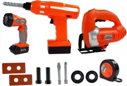 Ten bogato wyposażony zestaw dla małych majsterkowiczów zapewnia realistyczne doświadczenia z warsztatu. Ergonomicznie ukształtowane narzędzia dobrze leżą w dziecięcej dłoni, a dzięki zasilaniu bateryjnemu naśladują prawdziwe funkcje: wkrętarka wkręca i wykręca, wyrzynarka porusza się i wydaje autentyczne dźwięki, a latarka świeci intensywnie i można ją ustawić według potrzeb.