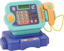Dziecięca kasa sklepowa niebieska z monetami i koszykiem