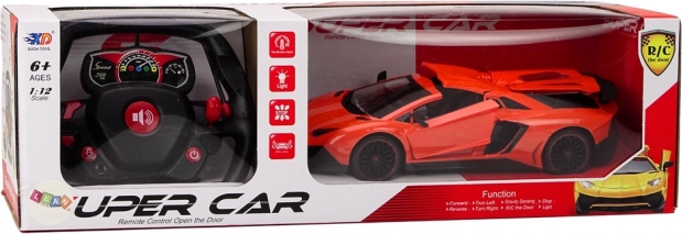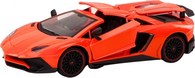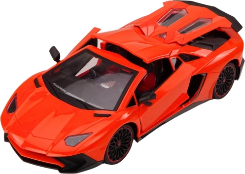 Pomarańczowa karoseria z czarnymi detalami tworzy autentyczny wygląd samochodu sportowego. Wszystkie drzwi są otwierane, co zwiększa realizm.