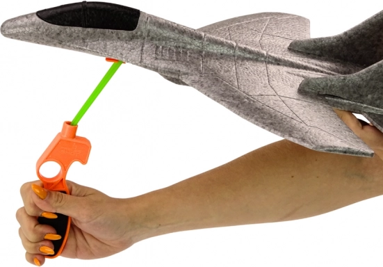 Styropianowy myśliwiec jest wyposażony w wyrzutnię z gumką, która dodaje zabawie emocji. Wystarczy zaczepić gumkę o tylną część samolotu i lekkim szarpnięciem wypuścić go w powietrze, by wzbił się ku chmurom.