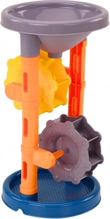 Zestaw zabawek do piasku z młynkiem to niezbędne wyposażenie dla każdego małego miłośnika plaży lub zabaw w piasku. Centralnym elementem jest młynek z dwoma kółkami, który pełni podwójną funkcję: z jednej strony ma sitko do przesiewania piasku, a z drugiej lejek.