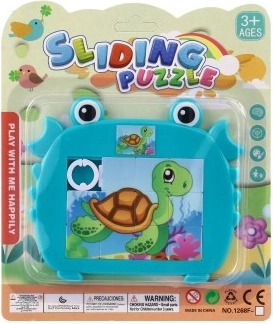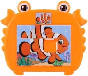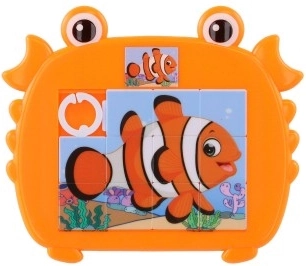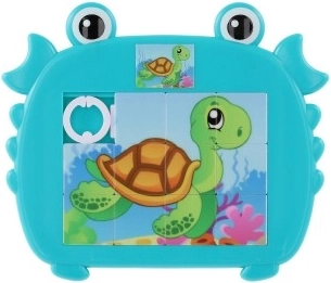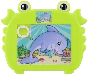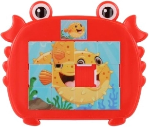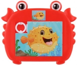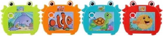 Wesołe i kolorowe dziecięce przesuwane puzzle w kształcie kraba z motywami morskich zwierzątek. Zabawa i rozwijające umiejętności dla małych zręcznych paluszków dzięki atrakcyjnym morskim motywom.