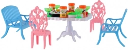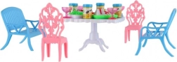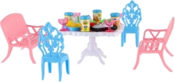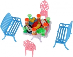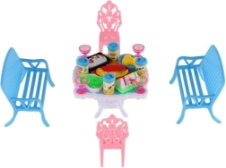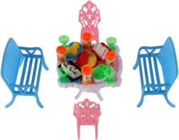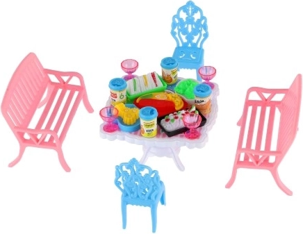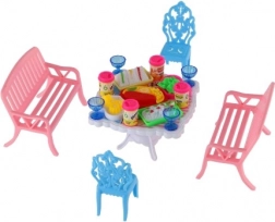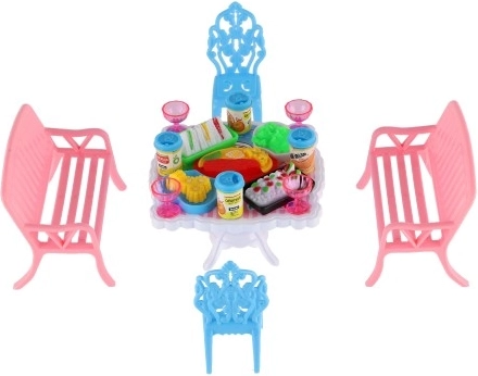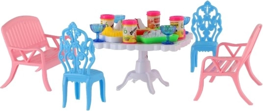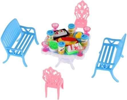 Zestaw zawiera 2 ławki, 2 krzesełka i stół uzupełnione o 13 akcesoriów – szklanki, puszki, talerze i tacę. Wszystko, czego potrzeba do uczty twoich lalek.