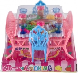 Wesołe różowe i niebieskie elementy z białym stołem tworzą atrakcyjne połączenie kolorów. Realistycznie wykonane mini dodatki dodają zabawie w restaurację właściwego sznytu.