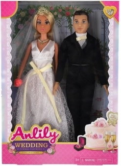 Ten ślubny zestaw lalek ANLILY wnosi do dziecięcej zabawy romantykę i styl. Panna młoda lśni w białej, koronkowej sukni z welonem i tiarą, a pan młody jest przygotowany w eleganckim czarnym smokingu z białą koszulą i muszką. Dzięki wytrzymałemu wykonaniu z plastiku lalki świetnie nadają się do codziennej zabawy.