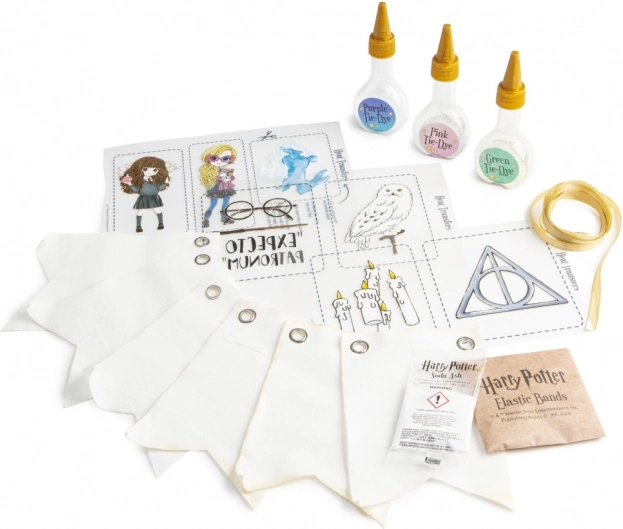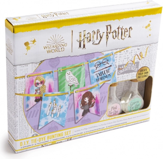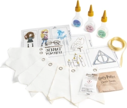 Stwórz własne magiczne dekoracje z kreatywnym zestawem do batikowania chorągiewek z motywami Harry’ego Pottera. Ten kompletny set zawiera wszystko, czego potrzebujesz do szybkiego i zabawnego tworzenia oryginalnych girland – od 3 barwników do batiku, przez 6 tekstylnych chorągiewek, po złotą wstążkę. Idealny na dziecięce przyjęcia, imprezy tematyczne oraz do ozdoby pokoju małych czarodziejów.