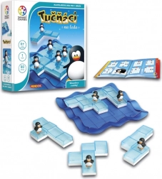 Wybierz zadanie z książeczki, ułóż pięć elementów lodu na planszy i ustaw ich kształt tak, aby pingwiny odpowiadały pozycjom w zadaniu.