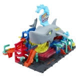 Odkryj ekscytujące przygody z myjnią Hot Wheels City, gdzie dominujący rekin wciąga dzieci do akcji. Wjedź do dołączonego pojazdu Color Reveal po rampie prosto do otwartej paszczy rekina! Naciśnięciem głowy rekina zmień kolor wody i obserwuj, jak odsłania nowe dekoracje na Twoim pojeździe.
