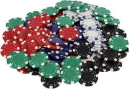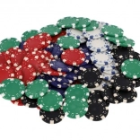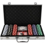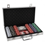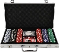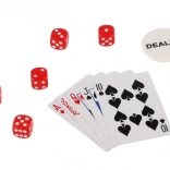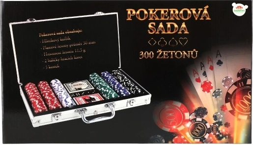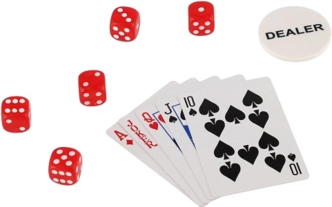 Zestaw obejmuje 300 żetonów w pięciu różnych kolorach, dwie talie kart do gry oraz pięć kości, co umożliwia rozgrywkę w różne gry karciane i kościane.