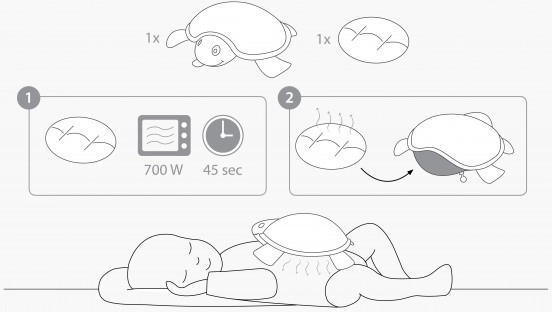Wskazówka: Umieść nagrzaną poduszkę w łóżeczku przed snem dla przyjemnego ogrzania i poczucia bezpieczeństwa. Zawsze przestrzegaj zasad bezpieczeństwa podczas podgrzewania i używaj produktu pod nadzorem dorosłych.