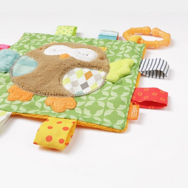 Ta urocza przytulanka jest wykonana z miękkich, przyjemnych w dotyku materiałów. Dzięki kółku do zawieszenia łatwo ją przymocować do fotelika samochodowego lub wózka, co ułatwia korzystanie w podróży. Kolorowe, zróżnicowane faktury na brzegach zapewniają dziecku nie tylko stymulację wzrokową i dotykową, ale także kojące wrażenia.