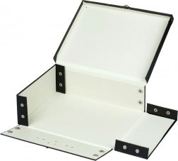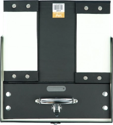 Kufer wyposażono w metalowe narożniki i klasyczną klamrę dla bezpiecznego zamknięcia. Dodatkowo posiada zatrzaski, które umożliwiają łatwe składanie i rozkładanie.