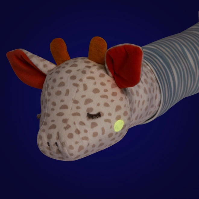 Urocza, wygodna żyrafa, która zamieni dziecięce łóżeczko w idealne i przytulne miejsce do spania. Może być używana jako osłona przed przeciągiem, ochrona przed upadkiem, miękka poduszka lub przytulanka. Żyrafa jest wyposażona w elementy świetlne, które pomogą dziecku lepiej zasnąć w nocy i pozbawią je strachu przed ciemnością. Pluszaka można prać w pralce w delikatnym programie.