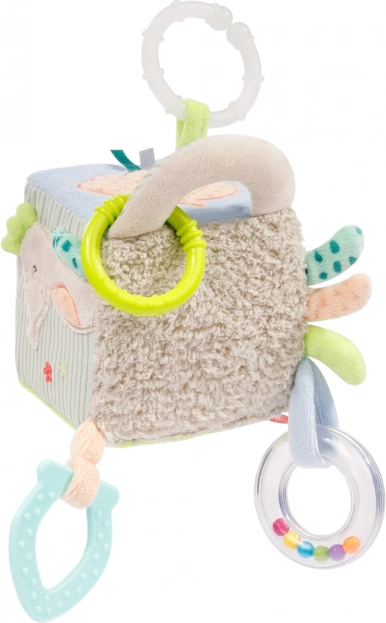 Dzięki praktycznemu pierścieniowi w kształcie C materiałową kostkę z morskimi zwierzętami można łatwo przymocować do wózka i fotelika samochodowego, więc szybko stanie się wiernym towarzyszem dziecka!